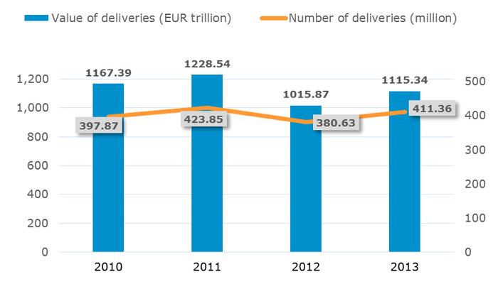 Over the year, European CSDs collectively processed around 410 million delivery instructions, 30 million more than in 2012. In terms of value, these delivery instructions represented over EUR 1.1 quadrillion, well above last year’s settlement volumes but still below the peak in 2011: